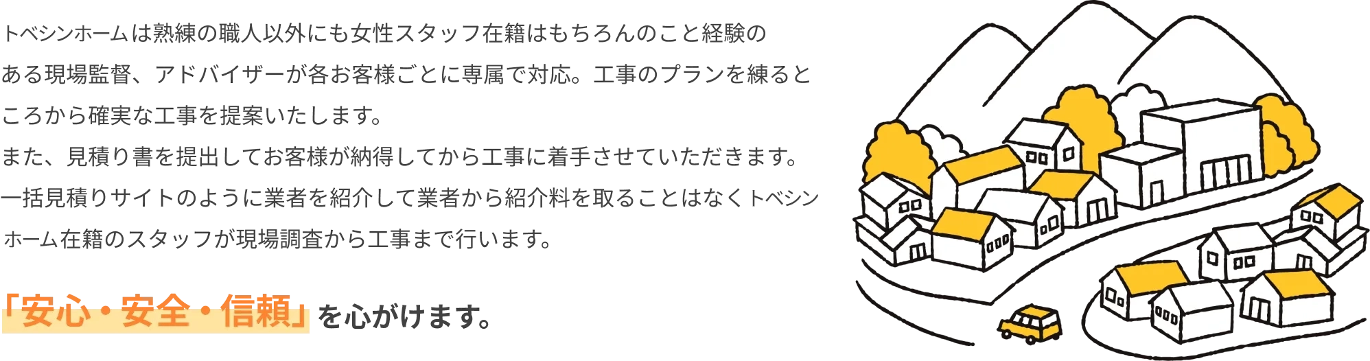 トベシンホームでは詳細な見積書を作成しておりますので、無駄な価格上乗せをしないことをお約束いたします。